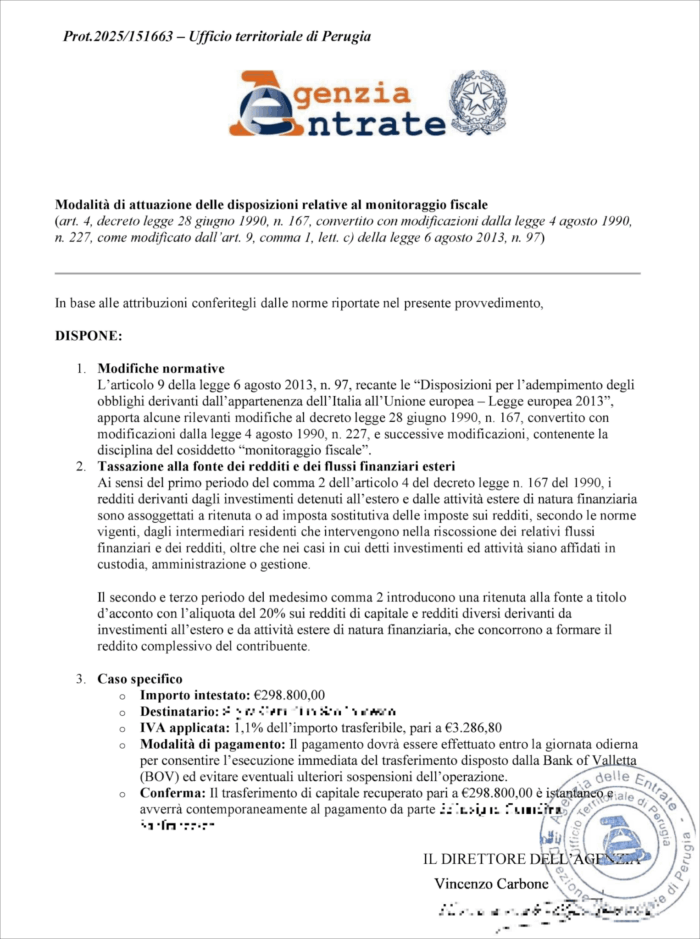 È di nuovo in atto, infatti, una campagna phishing veicolata via email che ha per oggetto “Modalità di attuazione delle disposizioni relative al monitoraggio fiscale”, finalizzata a richiedere il versamento in giornata di un importo a titolo di ritenuta alla fonte. Si tratta però di un documento falso, che presenta il logo dell’Agenzia delle Entrate, un falso numero di protocollo e la firma contraffatta del direttore delle Entrate.